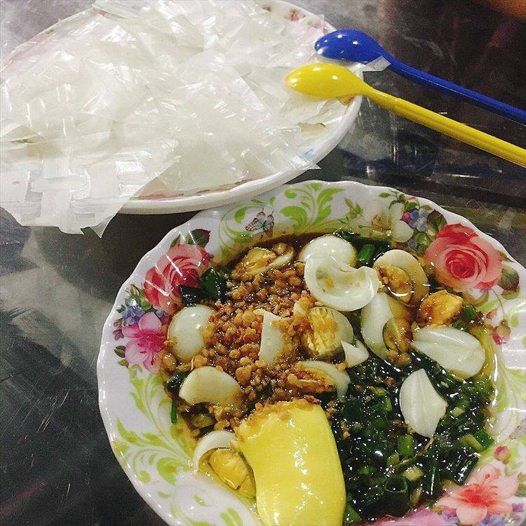 Phần sốt này làm khá cầu kỳ, sốt me cắt thêm trứng cút luộc, kèm theo đó là bơ và lượng mỡ hành hào phóng và đậu phộng. Trước khi ăn, bạn nên trộn đều hỗn hợp rồi trực tiếp lấy bánh tráng chấm và xúc luôn hỗn hợp trứng - bơ - hành đó để thưởng thức.