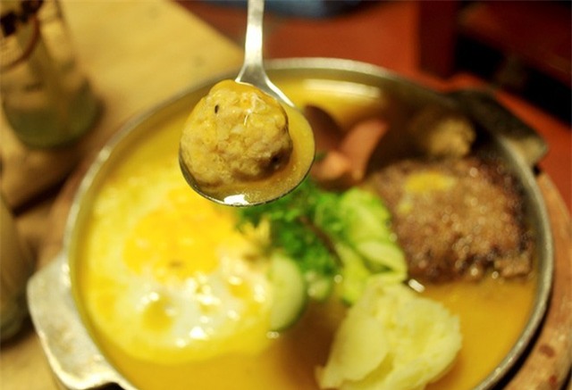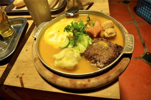 Món ăn là sự kết hợp giữa bánh mì pate truyền thống với bánh mì bít tết của phương Tây, có thêm nước sốt sánh. Đặc biệt, tất cả đều được đun nóng và giữ nhiệt trên chảo gang nên rất dễ khiến khách có cảm giác ngon miệng, thèm ăn trong mùa đông.