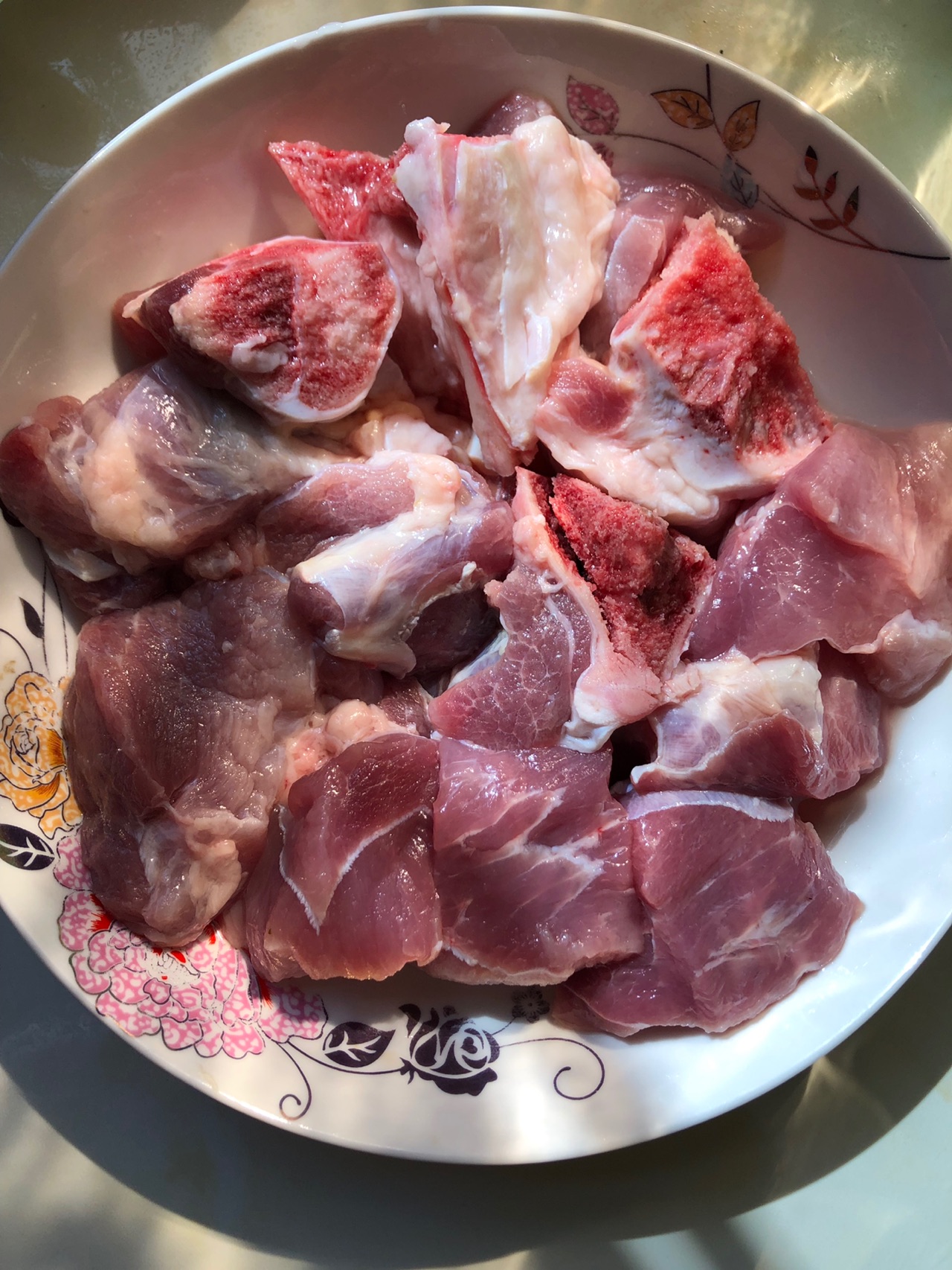 Bước 1: Khoai môn gọt vỏ, rửa sạch và cắt thành từng miếng. Thịt heo rửa sạch, cắt thành từng lát mỏng, thêm muối, bột ngô, nước tương và gừng băm vào trộn đều.