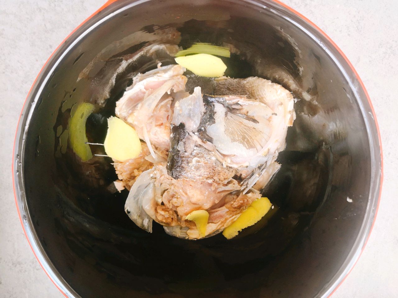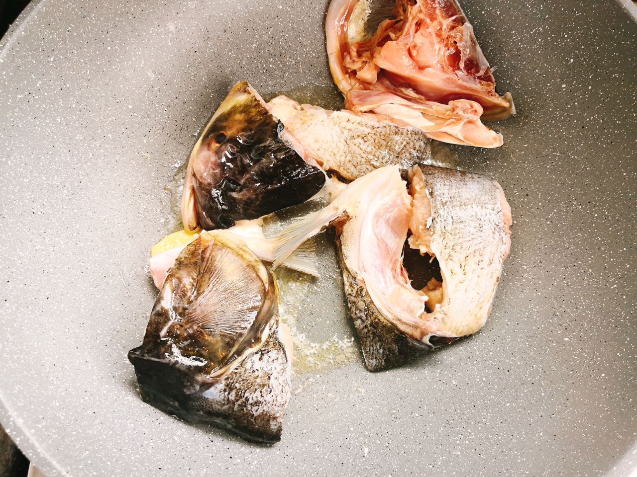 Bước 1: Làm sạch đầu cá rồi cắt thành miếng nhỏ. Đun nóng dầu trong chảo và thêm gừng thái lát vào. Thêm đầu cá vào và chiên cho đến khi chín vàng nhẹ. Sau đó cho cá vào nồi cùng với các lát gừng.