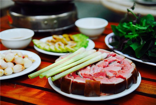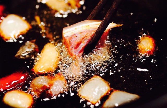 vào dầu đang nóng rồi nhúng thịt dê vào. Việc kết hợp hành khô vào dầu