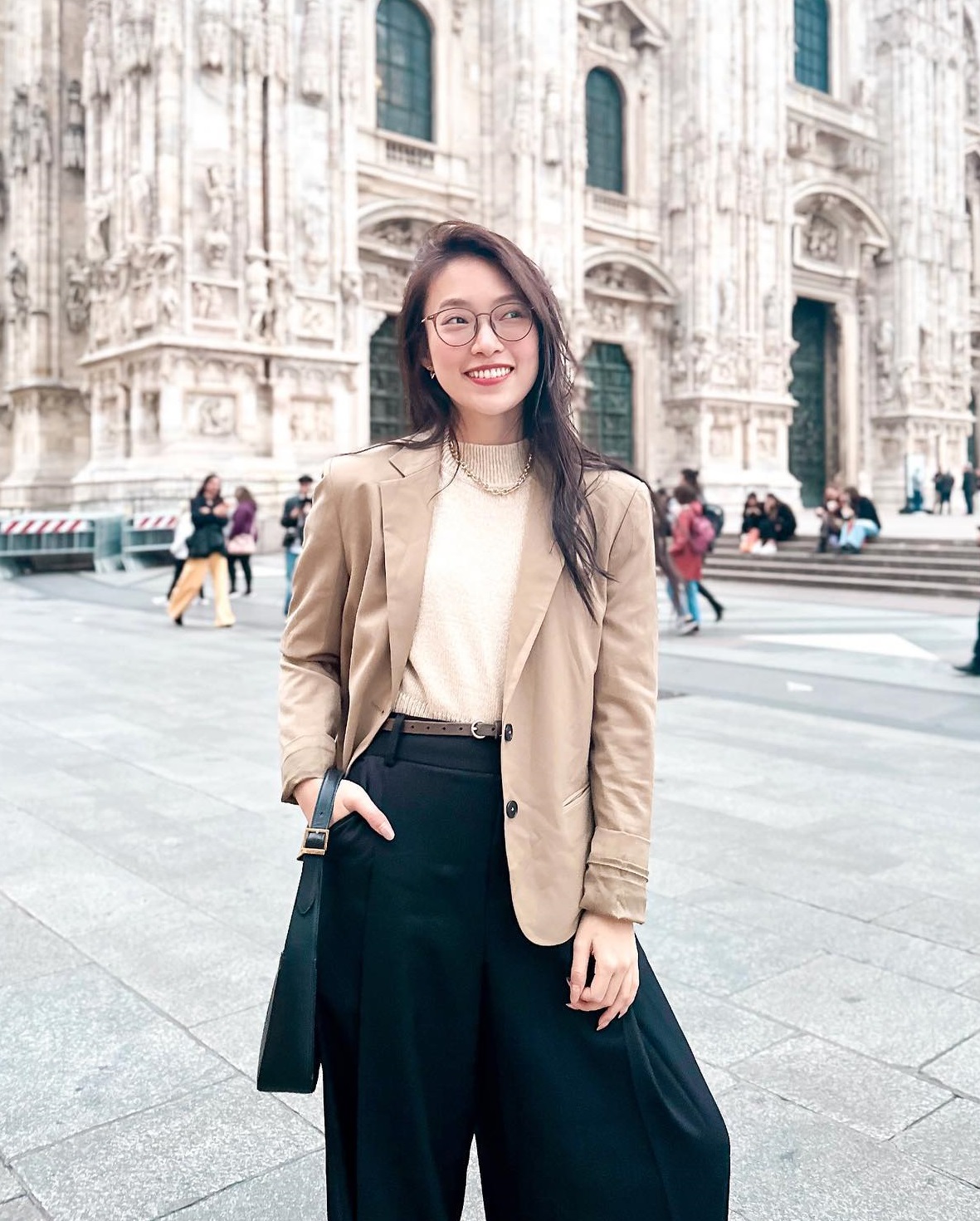 Đỗ Thị Hà cũng có nhiều set trang phục tối giản rất đáng học hỏi. Khi diện áo thun, quần âu và áo trench coat, Đỗ Thị Hà ghi điểm ở sự thanh lịch, sang trọng. Ngọt ngào và nữ tính hơn là các set váy liền màu trung tính, hay áo kẻ ngang kết hợp với chân váy denim.