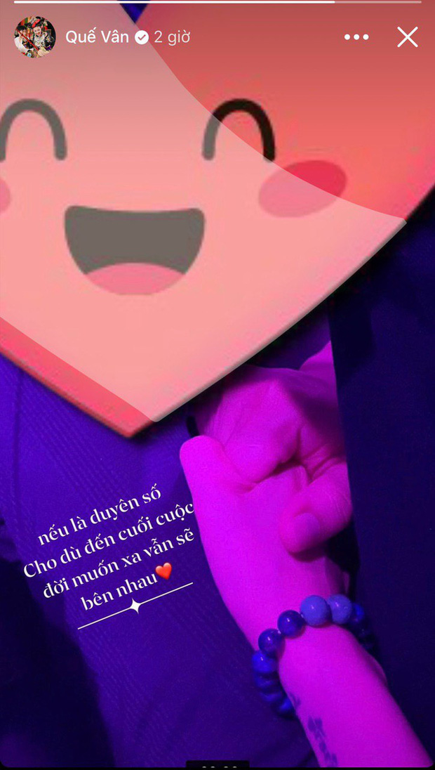 Mới đây nhất, trên trang cá nhân, Quế Vân gây bất ngờ khi công khai khoảnh khắc nắm tay tình tứ bên bạn trai mới. Cô đính kèm dòng chú thích ngọt ngào: "Nếu là duyên số. Cho dù đến cuối cuộc đời muốn xa vẫn sẽ bên nhau". Đây là lần hiếm hoi Quế Vân tiết lộ về bạn trai nhưng cô vẫn nhất quyết giấu kín diện mạo của người này. Dân tình đang rất nóng lòng chờ đợi ngày Quế Vân chính thức công khai người yêu bí mật.