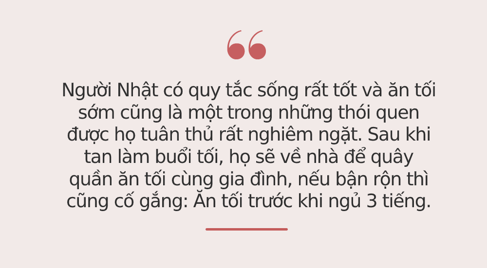 Người Nhật có quy tắc sống rất tốt và ăn tối sớm cũng là một trong những thói quen được họ tuân thủ rất nghiêm ngặt. Sau khi tan làm buổi tối, họ sẽ về nhà nhanh chóng để quây quần ăn tối cùng gia đình, nếu bận rộn thì người dân nước này cũng cố gắng thực hiện nguyên tắc: Ăn tối trước khi đi ngủ 3 tiếng. Có như vậy mới đảm bảo dạ dày có đủ thời gian để tiêu hóa cơm và thức ăn, đồng thời đảm bảo dinh dưỡng được hấp thụ đầy đủ.