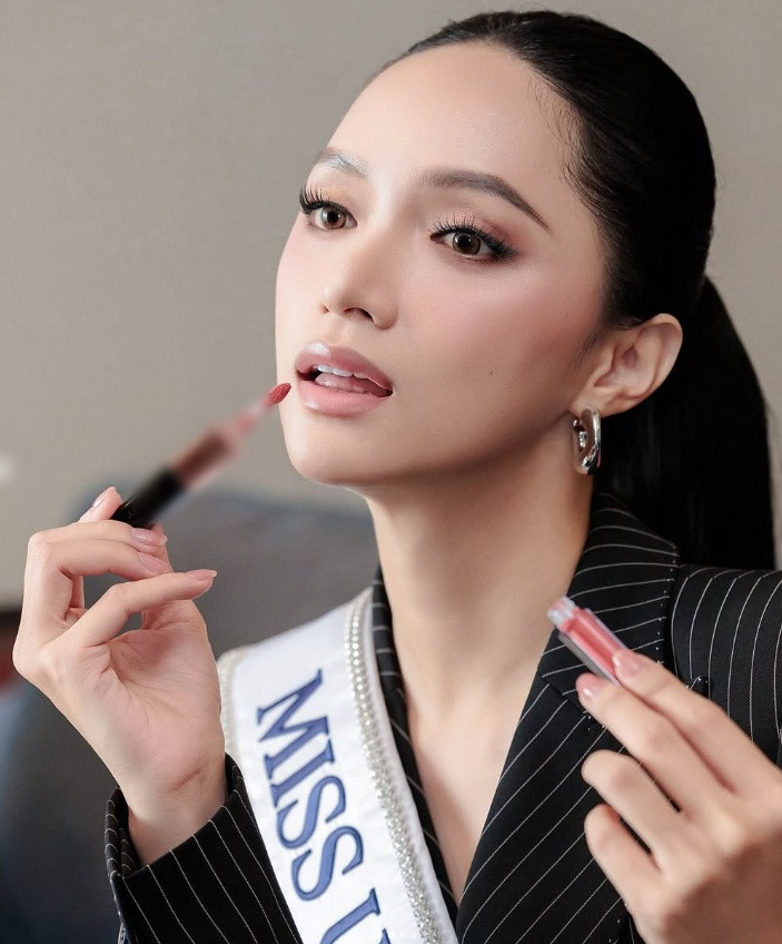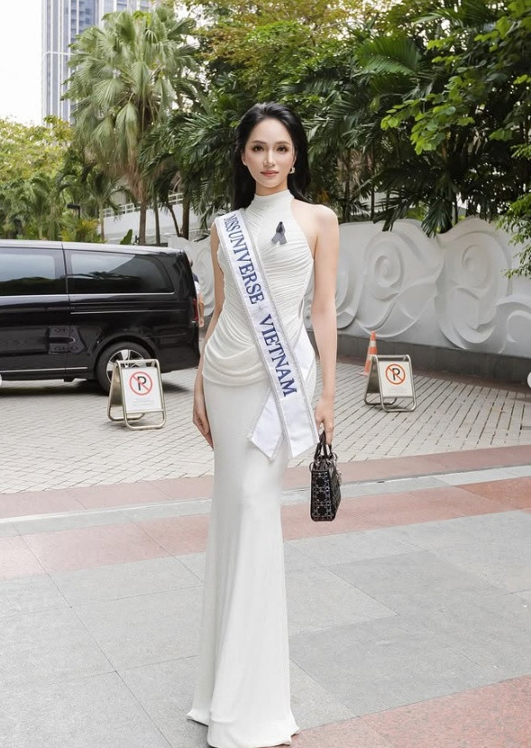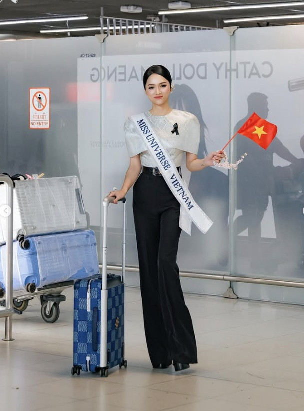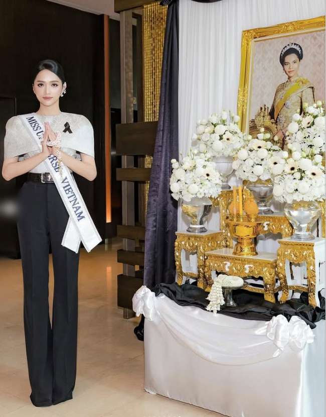 Ngày 31/10 vừa qua, Hương Giang chính thức đại diện Việt Nam lên đường sang Thái Lan chinh chiến Miss Universe 2025. Xuất hiện tại sân bay ở xứ Chùa Vàng, người đẹp tinh tế thay bộ trang phục kín đáo gồm áo trắng và quần đen ống loe hack dáng.Đáng chú ý, mỹ nhân chuyển giới ghi điểm khi cài thêm chiếc nơ đen nhỏ trên áo để tưởng nhớ Vương Thái hậu Sirikit vừa qua đời và Thái Lan đang chịu quốc tang.Ngày đầu nhập cuộc, Hương Giang tiếp tục chinh phục fans sắc đẹp khi lựa chọn chiếc đầm ôm sát màu trắng tôn trọn vóc dáng. Người đẹp lựa chọn kiểu tóc xoăn lơi, trang điểm nhẹ nhàng khoe visual trong trẻo.Đặc biệt, Hương Giang vẫn chú trọng việc cài chiếc nơ đen nhỏ bên ngực trái một cách tinh tế.Đại diện Việt Nam tiếp tục ghi trọn "10 điểm không có nhưng" khi diện chiếc đầm nâu socola với điểm nhấn là phần tà bay bổng dài thướt tha. Chiếc nơ đen trên ngực trái vẫn được người đẹp cài rất chỉn chu, trang trọng.Sang đến lịch trình ngày thứ hai, Hương Giang hóa "tổng tài" trong bộ suit kẻ đen. Mỗi lần xuất hiện, người đẹp đều cho thấy được sự khéo léo trong cách chọn trang phục, make-up, làm tóc... Hương Giang và ekip nhận vô số lời có cánh từ người hâm mộ.