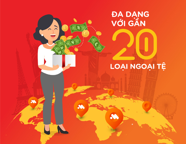| MSB cung cấp đa dạng gần 20 loại ngoại tệ khác nhau như USD, EUR, GBP, AUD, CAD, SGD, JPY…. với tỷ giá cạnh tranh và mạng lưới giao dịch rộng lớn, thuận tiện cho việc giao dịch của khách hàng |