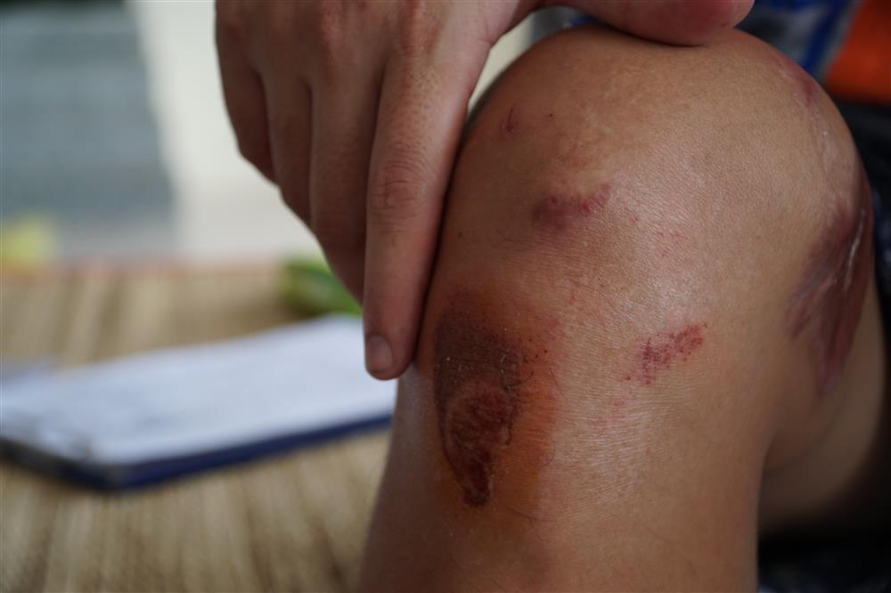 Những vết thương trên cơ thể lao động do té ngã trong cuộc đào tẩu và bị quản lý đánh trong thời gian làm việc tại Campuchia.