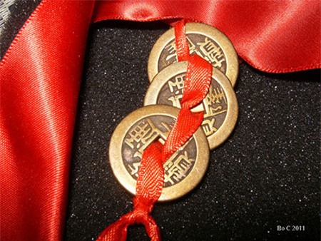 Những đồng tiền xu được sử dụng trong phong thủy là những đồng bạc được lưu hành vào thời vua Càn Long, triều đại nhà Thanh với hai mặt âm dương. Trên mặt đồng tiền mặt được chạm khắc rồng. Tiền hình trọn tượng trưng cho Thiên, ở giữa có lỗ vuông tượng trưng cho Địa. Theo phong thủy, để mang lại vận khí tốt cho sự nghiệp, nên bày ba đồng xu ở phía bên trái ban thờ.