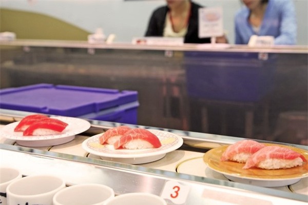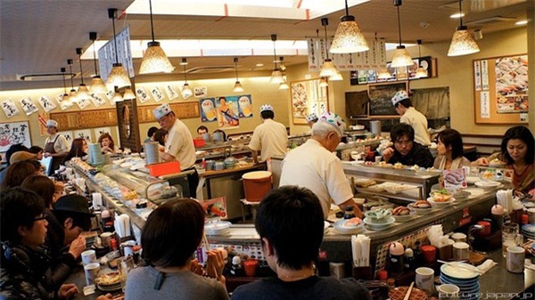 Kaiten sushi hay sushi băng chuyền: Theo truyền thống, sushi được đầu bếp phục vụ ở các quầy hoặc đưa tới tận bàn theo yêu cầu của thực khách. Tuy nhiên, ở kaiten sushi, các miếng sushi được đặt trên băng chuyền và đưa qua mỗi bàn, cũng là một cách thưởng thức phổ biến ở Nhật. Ảnh: Wasa-bi.