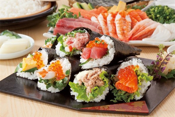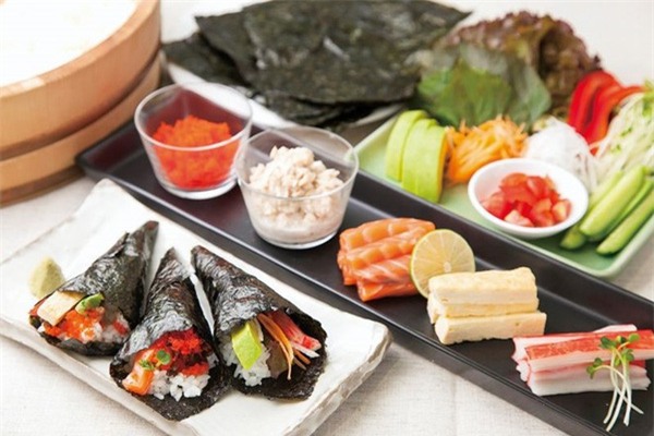 Temakizushi: Temakizushi là món sushi cuộn tay, được làm từ cơm sushi và lá tảo biển nori. Loại hình ốc quế vừa đẹp, vừa dễ làm. Bạn có thể tự chế biến temakizushi với hải sản, cơm và tảo biển. Ảnh: Wasa-bi.