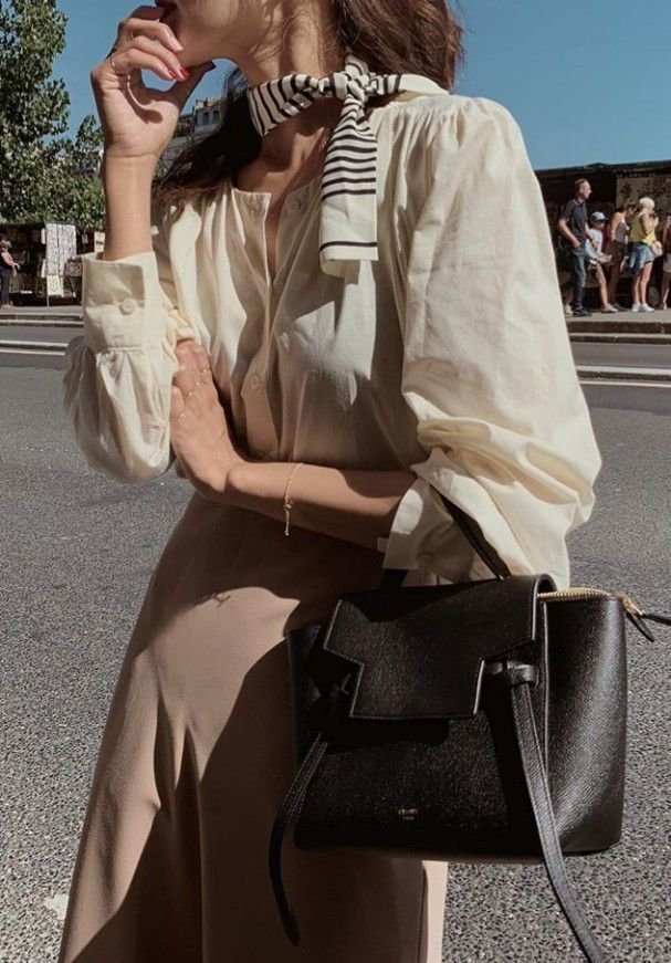 Mùa thu bắt đầu bằng việc nhấn nhá những chiếc khăn lụa mềm mại. Sơ mi và khăn lụa trở thành cặp đôi dịu dàng bắt nhịp không khí ngày thu sang. Một chiếc khăn lụa thắt hờ hững giúp giữ ấm cho phần cổ, và cũng tăng điểm phong cách cho các nàng trong thu này.