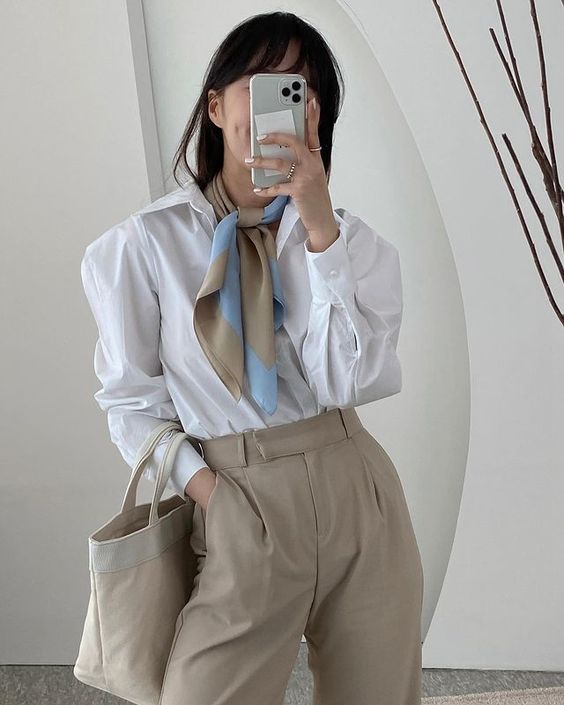 Có rất nhiều cách để kết hợp sơ mi cùng khăn lụa, đơn giản nhất là thắt khăn ngay ngắn qua cổ áo, hoặc không chỉ cần một chiếc khăn vắt ngẫu nhiên qua vai áo cũng đủ tạo nên dấu ấn riêng cho outfit của bạn.