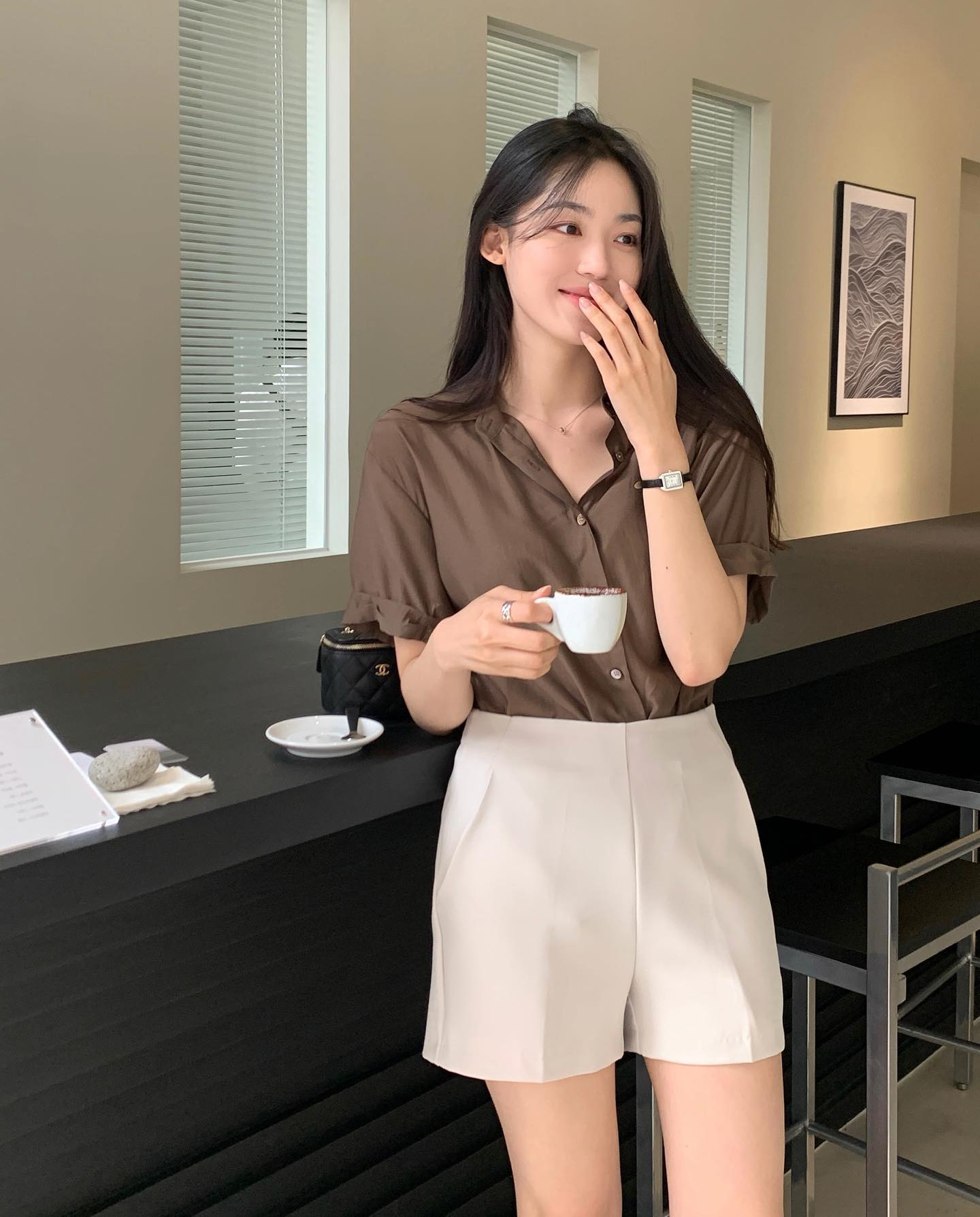 Với độ ngắn trên đầu gối, quần short còn tạo hiệu ứng chân dài hơn và vóc dáng thêm cao ráo. Có rất nhiều kiểu quần short phù hợp để mix với áo sơ mi tối màu, chẳng hạn như quần denim short, quần short vải thô hay quần short có đường li giữa… Nhưng dù lựa chọn thế nào, chị em cũng nên sơ vin để vẻ ngoài có được sự chỉn chu, thời thượng khi diện combo áo sơ mi tối màu + quần short.