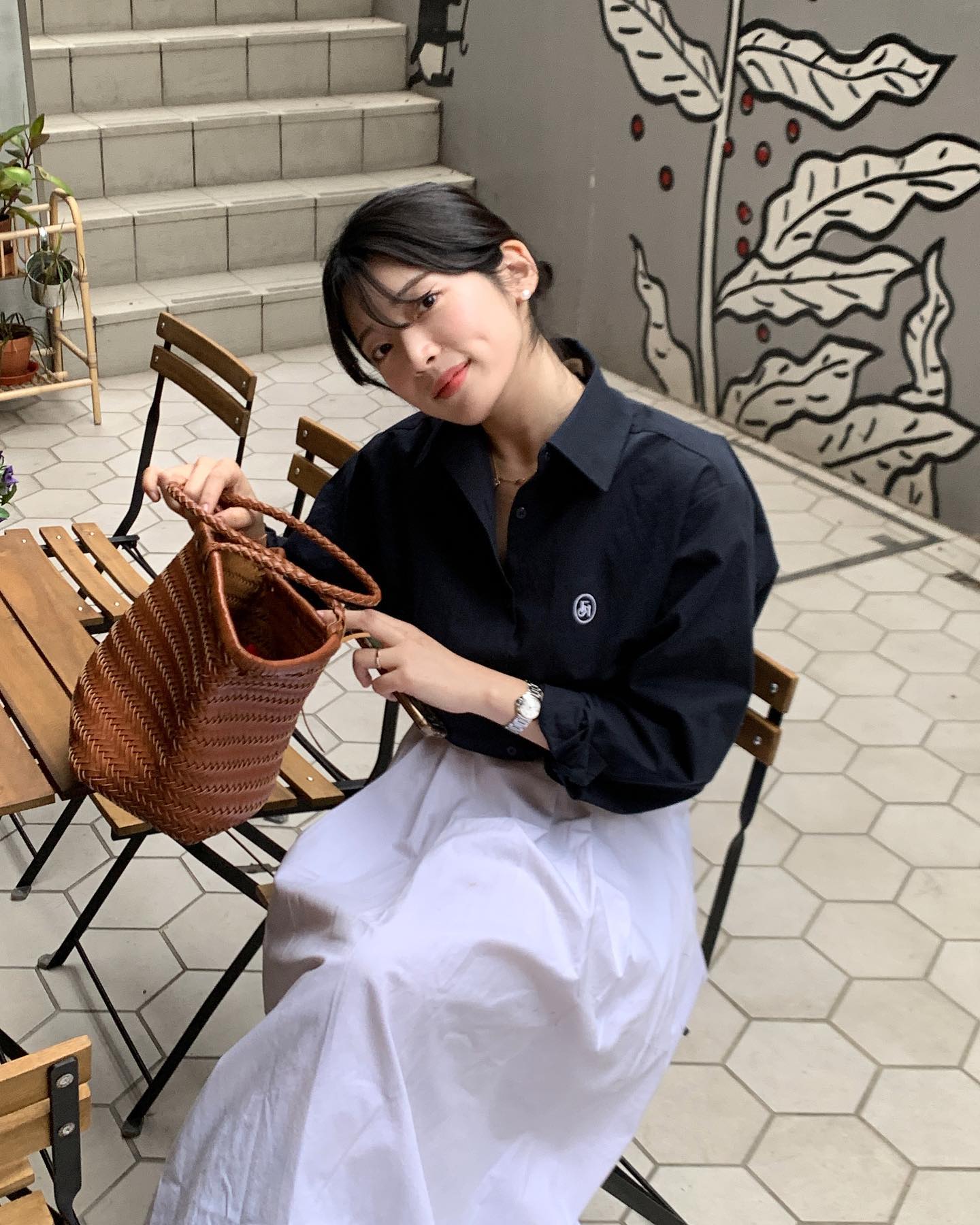 Không chỉ có quần dài hoặc quần short phù hợp để mix với áo sơ mi tối màu, chân váy cũng là mảnh ghép lý tưởng của mẫu áo thanh lịch này. Chị em nên chọn chân váy sáng màu để kết hợp cùng sơ mi tối màu. Như vậy, set đồ sẽ thêm phần trẻ trung. Áo sơ mi và chân váy còn mang đến nét thanh lịch, nữ tính cho người diện, chị em nên tham khảo để đa dạng hóa phong cách mùa hè.