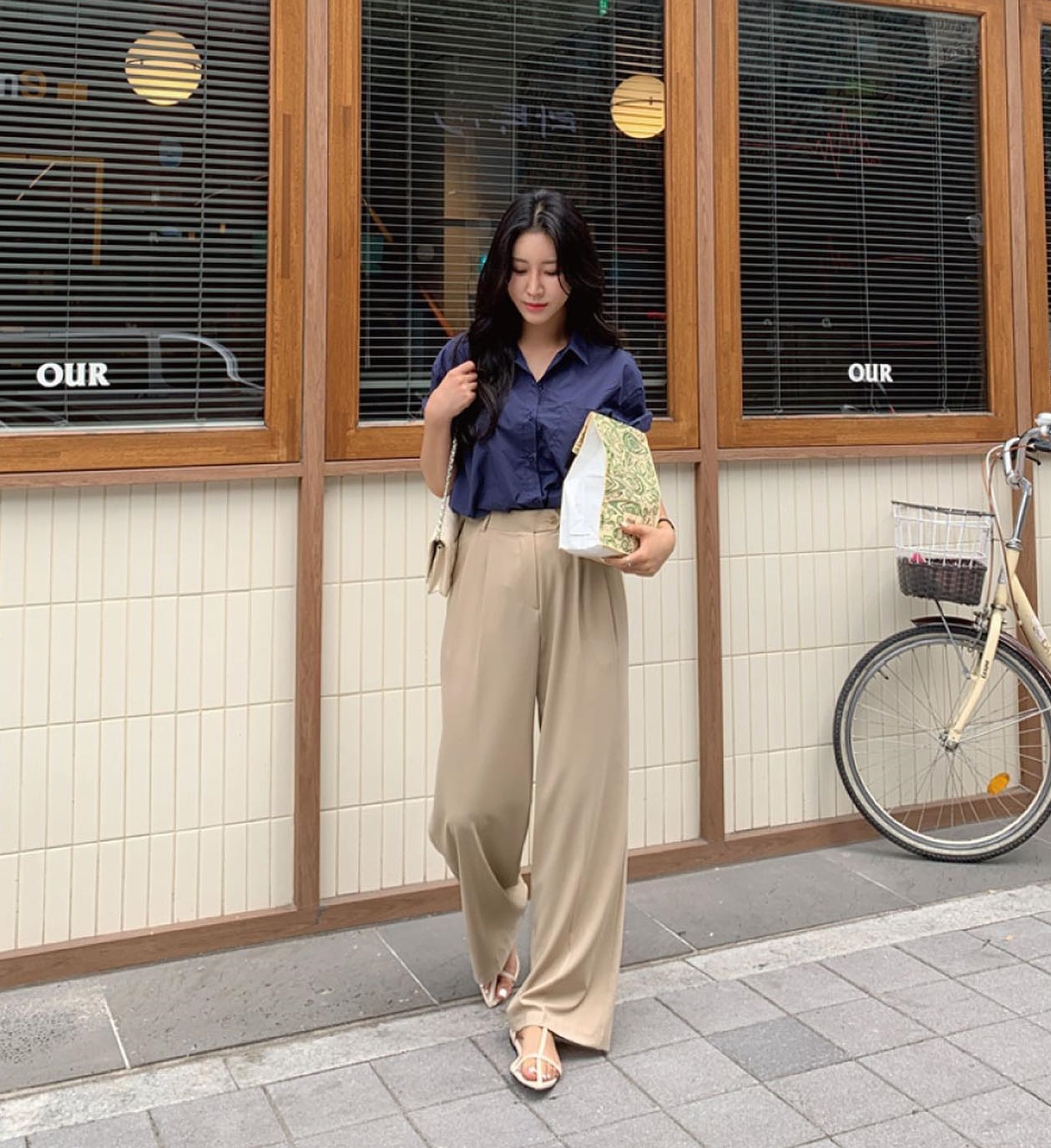 Áo sơ mi và quần ống rộng là công thức được yêu thích trong mùa hè. Nếu diện sơ mi tối màu, bạn nên kết hợp với một chiếc quần ống rộng mang tông màu trắng hoặc be. Như vậy, set trang phục trở nên sáng sủa và trẻ trung hơn. Ngoài ra, tô điểm túi xách và giày dép màu tươi sáng cho set áo sơ mi tối màu + quần ống rộng cũng là cách hay để tăng thêm hiệu quả "hack" tuổi. Chị em có thể áp dụng công thức áo sơ mi tối màu + quần ống rộng trong nhiều hoàn cảnh, đặc biệt là khi tới công sở.