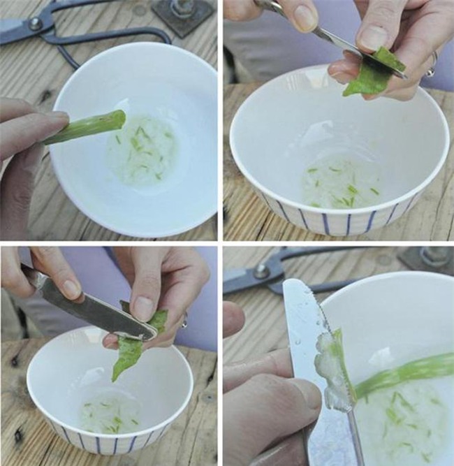 Bước 2: Sau thời gian trên đem thịt nha đam đi rửa sạch vài lần vào chậu nước sau đó bỏ tất cả vào máy xay sinh tố nghiền thật nhuyễn với dịch 2 viên nang vitamin E, 1 thìa nước cốt chanh nguyên chất.