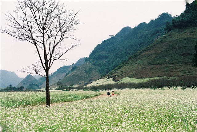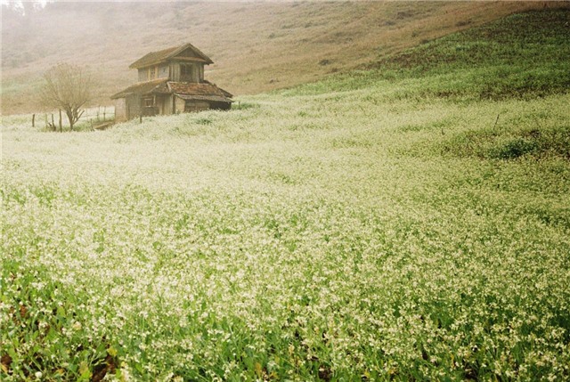 cùng dạo chơi trên con đường phủ đầy hoa cải trắng đi vào bản, thoang