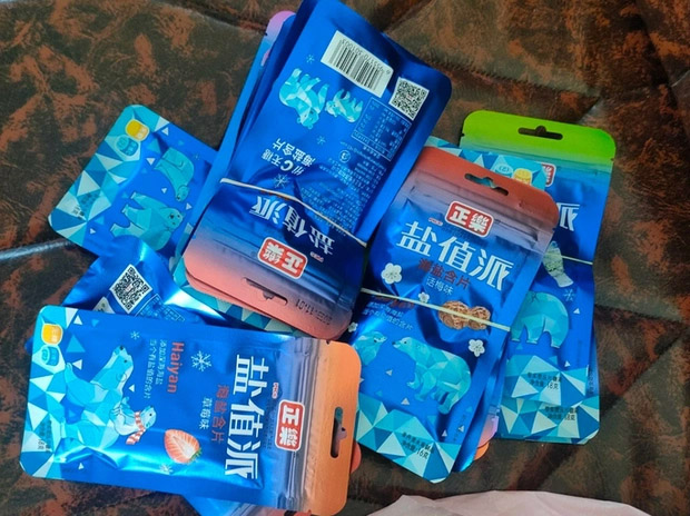Vỏ túi kẹo mà các học sinh đã mua ngoài cổng trường và ăn toàn chữ nước ngoài và không có tem phụ tiếng Việt
