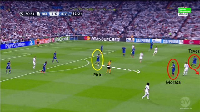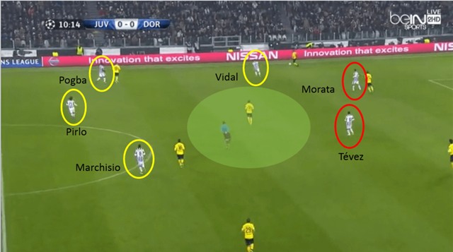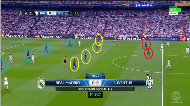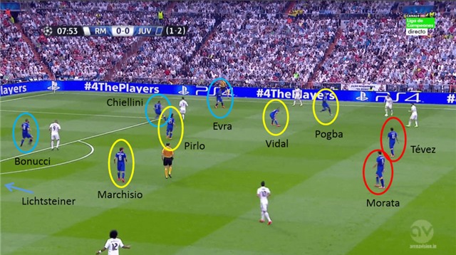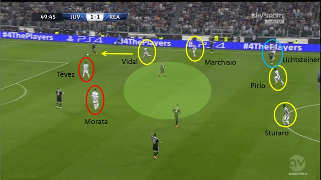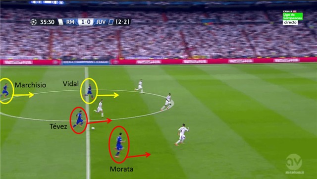 Juventus luôn nhịp nhàng, khi dâng cao áp sát đối phương (Vidal luôn đảm nhiệm vai trò áp sát ở tuyến trên)