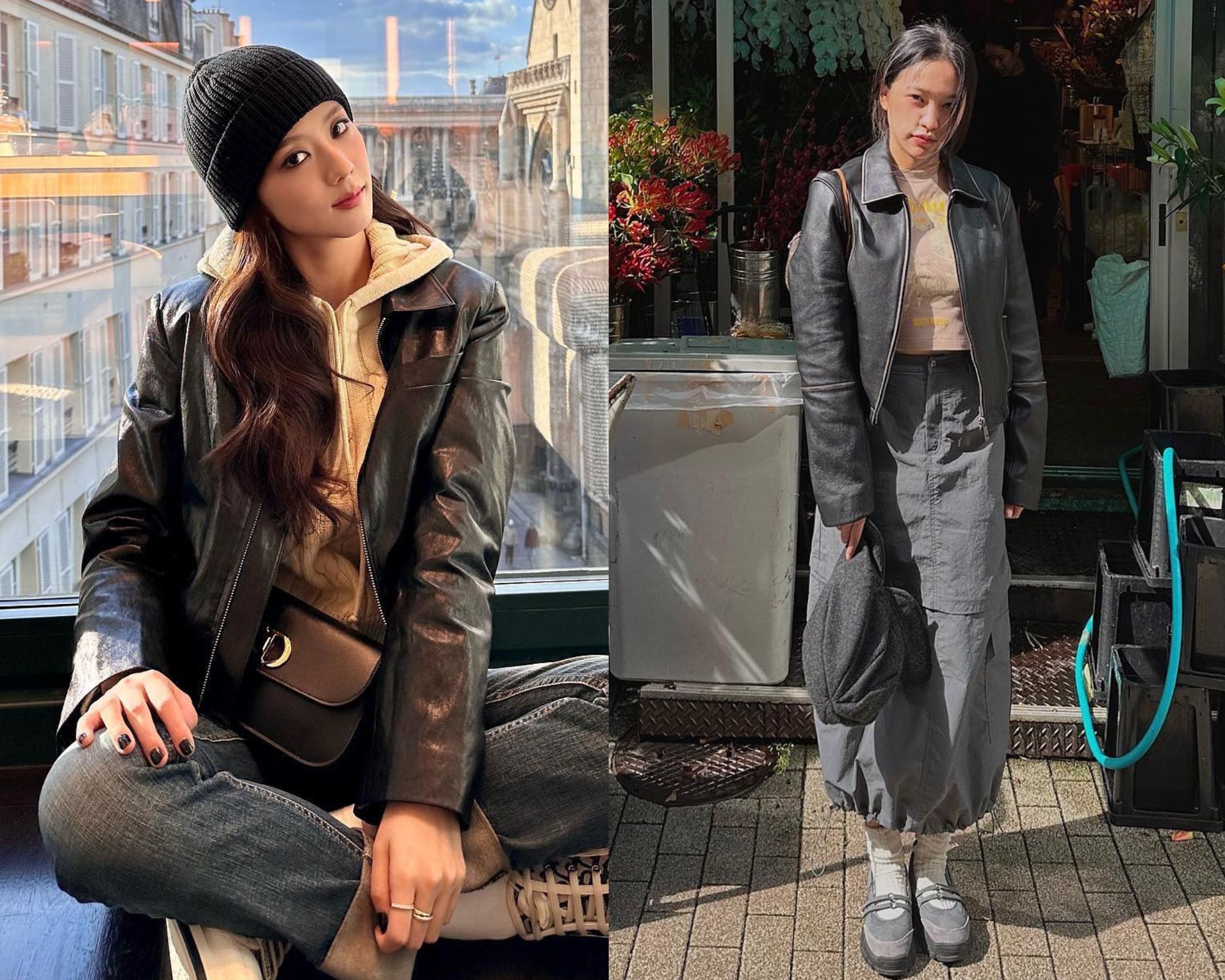 Áo khoác da đang là món thời trang chuẩn xu hướng mùa lạnh năm nay. Đây cũng là kiểu áo khoác được sao Hàn rất yêu thích. Áo khoác da thường mang tông màu đen hoặc nâu làm chủ đạo nhưng mẫu áo này vẫn giúp tổng thể trang phục trở nên nổi bật và trẻ trung. Nếu kết hợp áo khoác da với chân váy hoặc váy liền, các nàng sẽ có được bộ trang phục nữ tính nhưng vẫn "cool ngầu". Bụi bặm hơn là công thức áo khoác da kết hợp với quần skinny jeans và boots hay áo khoác da mix cùng quần ống suông.