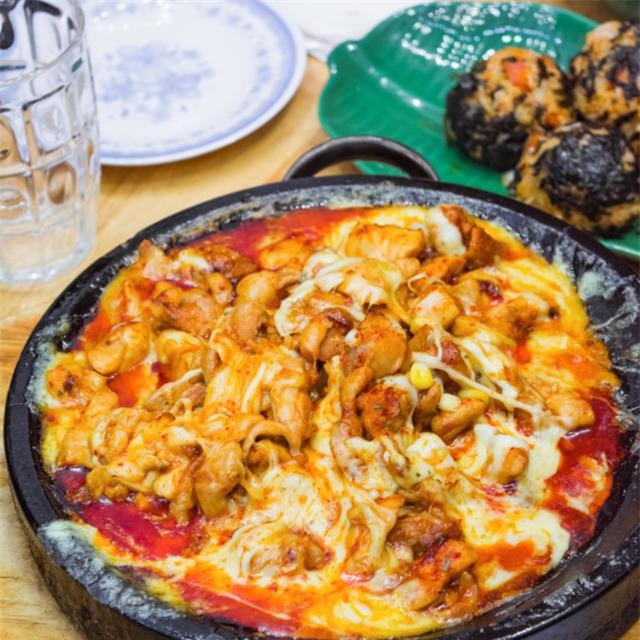 Gà nướng cơm phô mai là món ăn nhiều calo nhưng nhất định sẽ làm bạn muốn tạm vứt chiếc cân đi mà chén cho thoả lòng. Gà cơm nướng muốn ăn ngon hãy đến các quán Hàn ở khu Hưng Vượng, Hưng Phước phường Tân Phong quận 7 nhé. Giá khoảng 350.000đ/phần là cả chảo gà với nguyên con gà, ăn được khoảng 4 người.