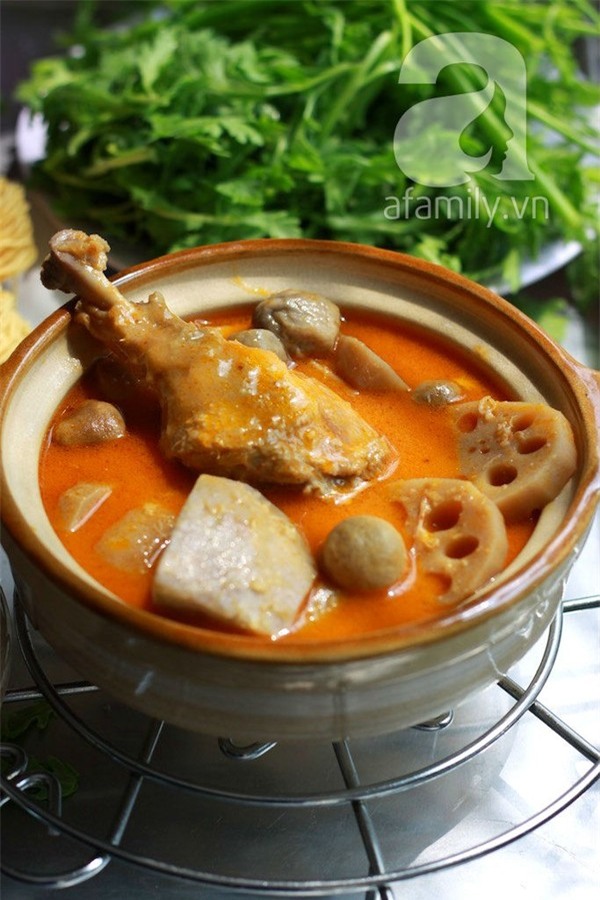 Vịt làm sạch để ráo. Bằm nhuyễn gừng, hoà vào 1/2 chén rượu trắng, xát đều lên mình vịt, để thấm trong nửa tiếng sau đó rửa sạch vịt, lau khô, chặt miếng lớn. Hành tím, tỏi bằm mỗi thứ 1 muỗng canh. Ướp vịt với hành và tỏi bằm, 2/3 hũ chao, 2 muỗng canh đường, 1 muỗng sa tế, 1 muỗng cà phê tiêu xay. Dùng tay bóp nhuyễn chao và trộn đều cho thấm vịt, để 30 phút. Khoai môn gọt vỏ sạch,cắt miếng vuông rồi chiên cho xém cạnh thì gắp ra đĩa để ráo dầu. Củ sen cắt khoanh, nấm ngâm muối rồi cắt chân. Bắc nồi với chút dầu ăn trên bếp lửa lớn, trút vịt vào xào cho thật săn đến khi vịt ra mỡ nhiều và nước xào gần cạn thì cho nước dừa vào cho ngập vịt. Bỏ thêm sả cây đập dập. Tiếp tục nấu với lửa vừa, vớt bỏ phần mỡ vịt. Cho củ sen vào. Vì củ sen lâu chín hơn khoai môn nên cần cho vào trước. Canh vịt hơi mềm bạn thêm nấm rơm rồi tiếp tục với khoai môn và ít dầu màu điều. Nêm lại cho vừa ăn: vị đậm, mặn vừa, ngọt dịu. Cho nước cốt dừa sau cùng đun sôi lại thì tắt bếp. Dọn ăn nóng trong lẩu với bún, mì.