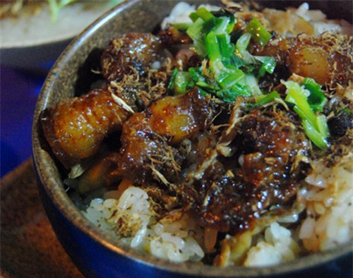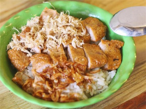 Xôi nấm để ăn sáng cũng ngon miệng mà làm bữa trưa hay bữa lót dạ về chiều thì đều ấm bụng. Không như cháo, món xôi có lẽ cần thêm một cái gì đó mằn mặn hơn. Hẳn đó là lí do chủ quán thêm vào thực đơn món xôi nấm thịt. Bát xôi nấm thịt vừa bưng ra đã thấy hấp dẫn. Bát nhỏ nhưng đầy ăm ắp thịt ba chỉ rang cháy cạnh lẫn với thứ ruốc nấm hương lạ miệng.