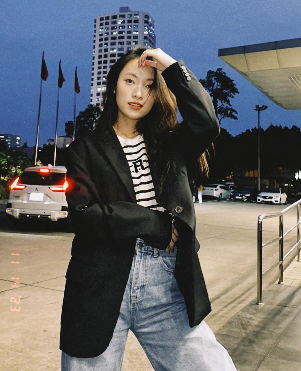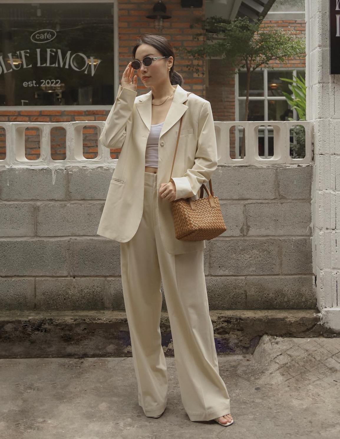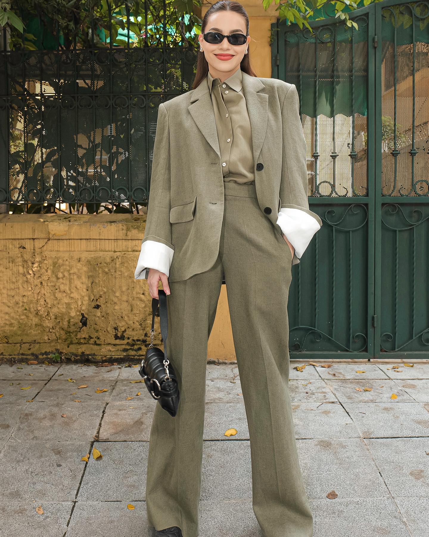 Ngoài ra, Lê Hà Trúc còn tôn dáng khéo léo bằng cách sơ vin bộ đôi áo và quần bên trong hoặc diện áo dáng lửng với blazer thanh lịch. Để hoàn thiện các set blazer chuẩn đẹp, Hà Trúc thường chọn những mẫu giày thời thượng như sandal cao gót, giày mule, loafer hoặc giày mũi nhọn.