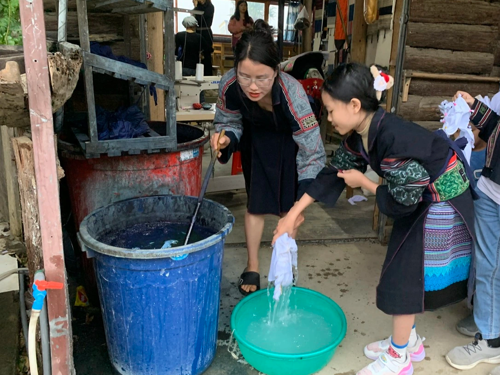 Học sinh trải nghiệm làm vải nhuộm chàm truyền thống của người H'Mông (Ảnh: Hoàng Hồng).