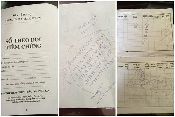 Bìa trong, bìa ngoài và cả phía trong cuốn sổ, nhiều chỗ chi chít những hình vẽ loằng ngoằng. Các trang ghi chú mũi tiêm trống trơn, duy chỉ có 2 mũi tiêm được ghi chú đã thực hiện là tiêm phòng viêm màng não cầu khuẩn BC tiêm ngày 23-3-2018 (mũi tiêm nhắc lại vào ngày 23-5-2018 nhưng chưa được thực hiện) và tiêm phòng sởi – quai bị - rubella tiêm ngày 29-3-2018 (mũi tiêm nhắc lại vào ngày 22-9-2018). Đoàn Thúy Hà liến thoắng giải thích rất nhanh trước khi có ai kịp hỏi thêm về cuốn sổ tiêm sơ sài: “Nó (đứa con của Hà – PV) xé rồi, nó toàn xé thôi, rách hết cả đây này chứ tiêm không thiếu mũi nào”.