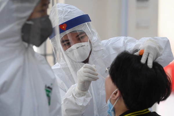 Nhân viên y tế lấy mẫu xét nghiệm sàng lọc tại Hà Nội. Ảnh: Việt Hùng.