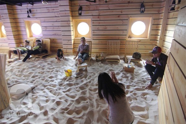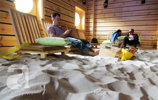 Quán cà phê này được trải một lớp cát dày mang từ Nha Trang về.