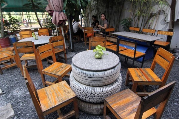 Bàn ghế của quán được "cải tạo lại từ bồn cầu, bồn rửa mặt.