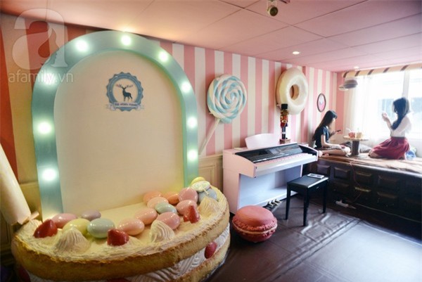 macaron, bánh kem khổng lồ, trong quán có một cây đàn piano dành cho