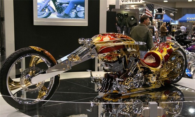 5. Yamaha Roadster BMS Chopper (3 triệu USD): Yamaha BMS sử dụng động vơ V-twin 1.700 cc. Đây là chiếc xe mạnh mẽ, nhưng đó không phải nguyên nhân khiến giá thành đội lên đến hàng triệu USD. Chiếc xe được thiết kế đặc biệt, yên bọc nhung đỏ và hầu hết các chi tiết còn lại đều được mạ vàng 24 karat. Yamaha BMS là biểu tượng của sự giàu có, xa xỉ và phô trương. Xe được định giá 3 triệu USD, số tiền đủ mua 2 chiếc Bugatti Veyron. |