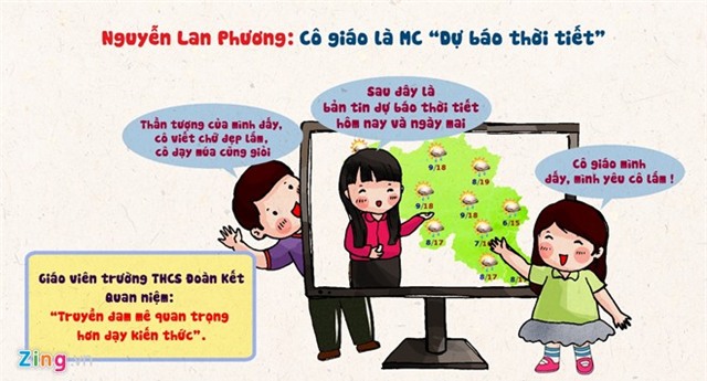 Cô giáo Lê Thị Lan Phương dạy Ngữ văn, Địa lý trường THCS Đoàn Kết (Hà Nội) được biết tới là MC xinh đẹp của chương trình Dự báo thời tiết trên truyền hình. Cô Lan Phương nổi tiếng với sự thân thiện và không ngừng nỗ lực trong phương pháp dạy học. |
