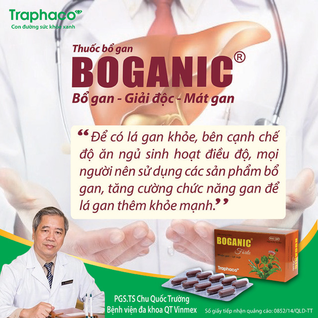 Boganic là thuốc bổ gan hàng đầu hiện nay (theo số liệu của IMS - health năm 2015) - hiệu quả đã được kiểm chứng qua 17 năm sử dụng của người tiêu dùng trên toàn quốc. 100% nguyên liệu sản xuất thuốc bổ gan Boganic là dược liệu sạch của Việt Nam, được trồng và thu hái theo tiêu chuẩn thực hành tốt trồng và thu hái cây thuốc của Tổ chức y tế thế giới (GACP - WHO). Tác dụng của Boganic đã được kiểm chứng tại nghiên cứu lâm sàng ở Bệnh viện K Trung ương và thực tế sử dụng tại hơn 500 cơ sở khám chữa bệnh trong cả nước. Nghiên cứu tại Bệnh viện K cho thấy, sau 10 ngày dùng thuốc bổ gan Boganic, 67% bệnh nhân men gan trở về bình thường. Năm 2015, trong lễ tổng kết 5 năm cuộc vận động “Người Việt Nam ưu tiên dùng hàng Việt Nam”, thuốc bổ gan Boganic của Traphaco đã được chọn vào Top 10 sản phẩm Thương hiệu Việt tiêu biểu xuất sắc. Thông tin về Chăm sóc sức khỏe lá gan xem thêm tại www.boganic.vn |