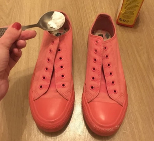 Những đôi giày bạn đi thường xuyên có thể có mùi khó chịu. Trong trường hợp này, hãy cho một ít baking soda vào trong giày rồi để qua đêm cho hết mùi hôi trước khi giặt.