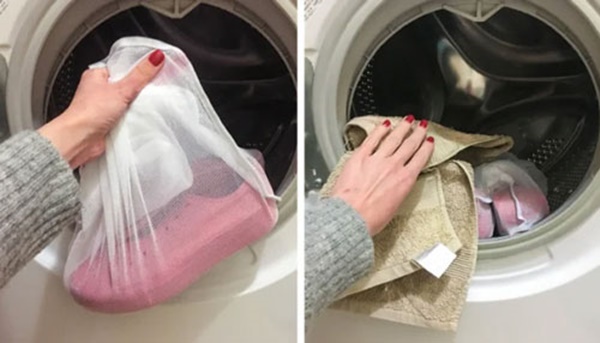Trong khi giặt, để bảo vệ đôi giày hãy cho giày vào túi giặt hoặc một chiếc vỏ gối cũ. Sau đó bạn cho thêm một chiếc khăn tắm mềm để bọc quanh giày để bảo vệ giày và giảm tiếng ồn. Nên dùng khăn màu trắng để tránh màu hỏng màu giày. Ngoài ra nên có một chiếc khăn riêng để giặt với giày vì bạn sẽ không thể dùng khăn này lau người được nữa.