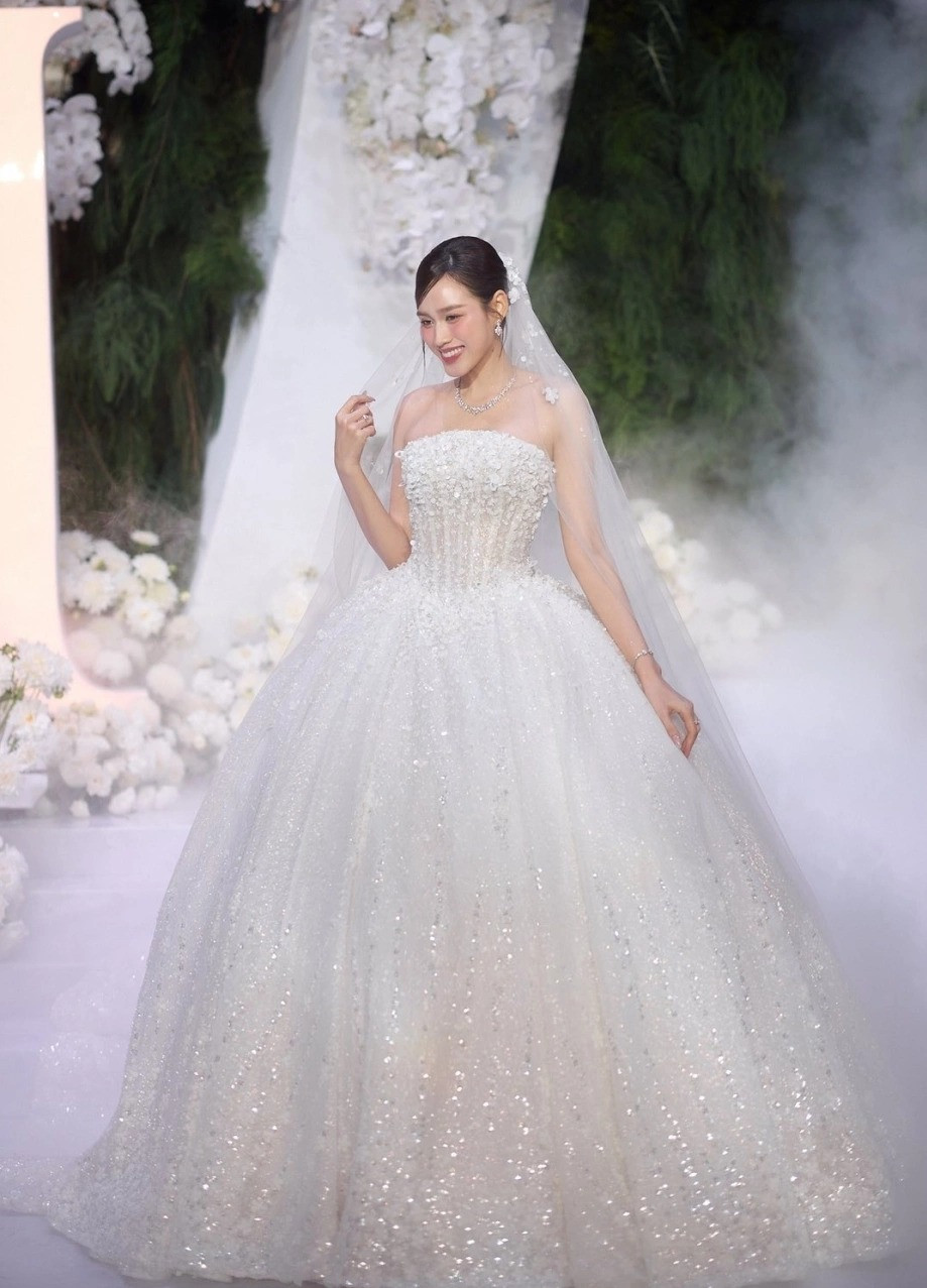 Đám cưới Tiên Nguyễn và chú rể Justin Cohen là một trong những đám cưới xa xỉ nhất trong năm 2025. Trong ngày trọng đại 7/12, cô dâu diện váy cưới đính hàng nghìn viên đá quý của Jimmy Choo. Đây là bộ váy được cô dâu đặt hàng riêng, được thiết kế theo ý tưởng và sở thích của Tiên Nguyễn. Bộ váy có phom dáng corset tôn đường cong người mặc, thân dưới xòe rộng bồng bềnh.Trong hôn lễ riêng tư tổ chức ngày 12/12 ở Đà Nẵng, Tiên Nguyễn diện váy của thương hiệu Miss Sohee. Thiết kế dáng ball-gown (váy xòe rộng, bồng bềnh) có chất liệu voan cao cấp. Phần corset lót gọng, kết hợp vải ren hoa xuyên thấu tạo nét quyết rũ cho cô dâu. Cô phối trang sức kim cương của Messika đồng điệu trang phục.Đám cưới của Hoa hậu Đỗ Thị Hà và chú rể Viết Vương cũng nhận được sự quan tâm không kém. Cô dâu Đỗ Thị Hà xinh đẹp tựa công chúa trong mẫu đầm bồng xòe đính sequin lấp lánh.Một thiết kế khác ôm sát phom đuôi cá chất liệu ren giúp cô dâu Đỗ Hà khai thác lợi thế hình thể.Top 10 Hoa hậu hoàn vũ Việt Nam cũng vừa tổ chức hôn lễ với ông xã doanh nhân vào ngày 9/12 vừa qua. Khác với những mỹ nhân khác, chân dài lựa chọn váy cưới chất liệu vải trơn cao cấp đem lại vẻ ngoài dịu dàng, không kém phần sang chảnh giống sao Hàn.Đám cưới Á hậu Chế Nguyễn Quỳnh Châu và chú rể Ngọc Phát là một trong những đám cưới vui nhất năm 2025 khi quy tụ nửa showbiz Việt với dàn khách mời toàn cái tên đình đám. Cô dâu diện đầm cưới phom cúp ngực màu trắng khoe nhan sắc rạng rỡ, tươi tắn.Quỳnh Châu và chú rể còn làm lễ thề nguyện ở nhà thờ.Chú rể Đình Tú và cô dâu Ngọc Huyền có một đám cưới đáng nhớ và đáng yêu trong năm 2025. Nữ diễn viên lựa chọn đầm cưới ren với phần khoét ngực điệu đà tôn vòng 1. Visual baby của Ngọc Huyền khiến nhiều người xao xuyến.