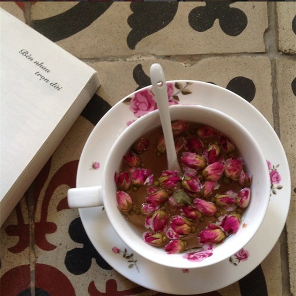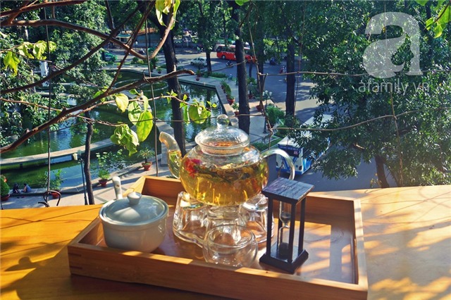 Trà ở đâykhông dọn theo set với ấm tách nhưng bù lại những chiếc cốc, chiếc đĩa mà quán dùng để dọn cho khách đều dễ thương, “lên hình" đẹp mắt chẳng thua kém nơi nào. Giá bánh hoặc nước tầm 40 - 60.000đ/phần, menu bánh thay đổi tuỳ ngày.