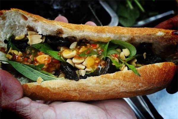 Khô bò kẹp vào bánh mì, rưới một ít nước sốt lên, dùng kèm rau răm, đậu phộng rang béo ngậy và tương ớt cay, khiến ai đã một lần ăn xong cũng thòm thèm. Giá bán một ổ chỉ từ 12.000đ, đây là món ăn thích hợp cho buổi xế chiều hơn là bữa sáng.