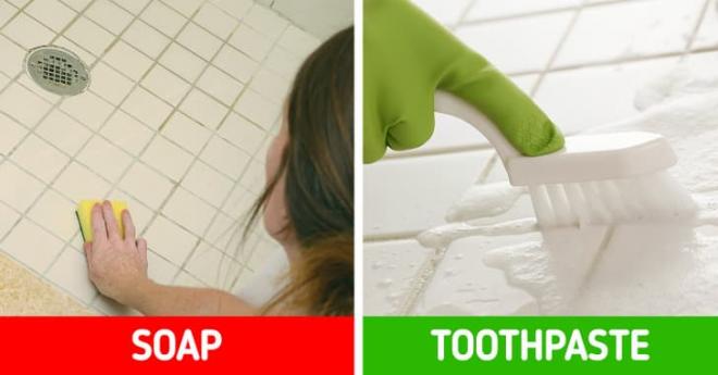 Thấm một chút kem đánh răng vào miếng bọt biển và chà kỹ để loại bỏ xà phòng tích tụ cũng là một mẹo hay. Tuy nhiên, đừng sử dụng quá thường xuyên vì chất tẩy trong kem đánh răng có thể làm mòn lớp sơn của một số vật dụng trong nhà tắm.