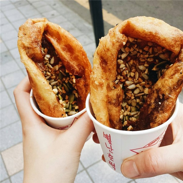 Bánh rán hotteok có thể tìm thấy ở khắp các con phố cứ Hàn vào mùa lạnh. Một điều cần lưu ý khi thưởng thức món này là hãy lưu ý khi cắn miếng đầu tiên nhé, thứ đường nâu ngọt và giữ nóng lâu sẽ khiến bạn bị bỏng miệng nhè nhẹ đấy.