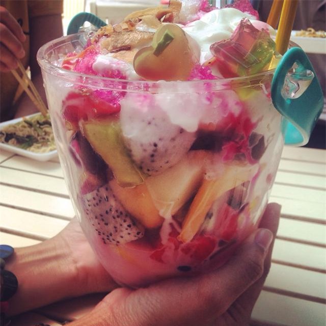 Những xô, tô gồm trái cây đủ loại như dưa, táo, bơ, cơm dừa, sa-po-che, mít, nho được xắt khối to, rưới lên trên là siro, sữa chua với rất nhiều đá bào thực sự là lựa chọn quá đỗi hợp lý cho mùa nắng nóng này ở Sài Gòn. Món giải nhiệt to đùng, hấp dẫn này có giá chỉ từ 18 ngàn đến 25 ngàn. Ở Sài Gòn, đường Tô Hiến Thành, quận 10 được mệnh danh là “con đường trái cây” của Sài Gòn với hơn chục xe bán trái cây tự chọn, từ tô, dĩa đến xô.