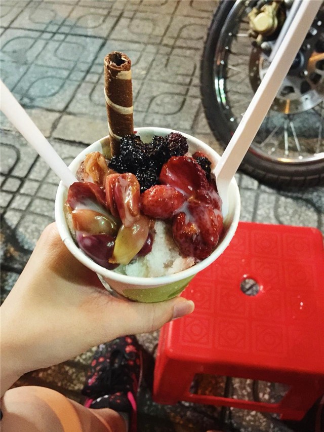 Mới xuất hiện trên đường Quang Trung quận Gò Vấp, nhưng đá bào mật trái cây đã nhanh chóng “hớp hồn” giới mộ ẩm thực Sài Gòn vì vừa lạ, vừa mát, ngọt ngọt thơm thơm, chỉ 15k/ly đầy ụ. Mật trái cây được chọn là các loại mật blueberry, rasberry nên chua nhẹ, ăn với đá bào bừa mát, vừa dễ chịu. Đá bào mật trái cây dự đoán có thể sẽ là món ăn vặt “bùng nổ” mùa hè năm nay ở Sài Gòn.
