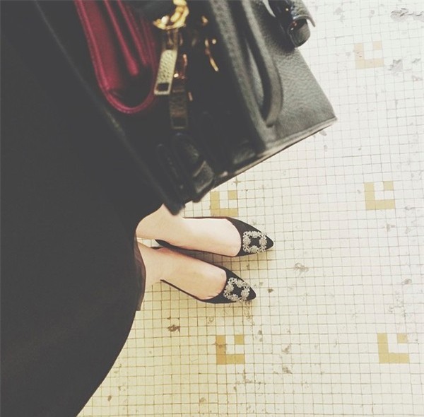 Đôi giày Manolo Blahnik bọc satin màu đen với hạt đá to đính ở mũi giày, có giá khoảng 20 triệu đồng.
