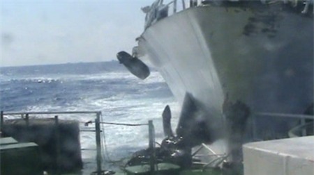 Lan can tàu cảnh sát biển Việt Nam bị gãy sau cú đâm của tàu hải cảnh Trung Quốc - Ảnh: Cắt từ clip của Cảnh sát biển Việt Nam |
