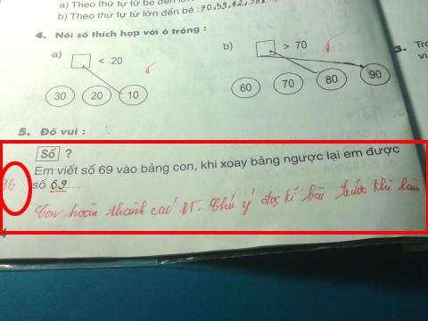 Phụ huynh này cho biết "Mình thường có thói quen kiểm tra bài vở của con khi đi học về. Hôm qua, mình mở sách vở ra kiểm tra và bất ngờ vì cô giáo gạch ngay đáp án của con mình cùng lời phê "Con hoàn thành các bài tập. Chú ý đọc kỹ bài trước khi làm". Mình cũng băn khoăn, thực hành lại hẳn hoi nhé, xoay bảng đủ kiểu vẫn ra 69. Không hiểu đố vui kiểu gì hay cô chấm sai mà chẳng có lấy một lời giải thích thấu đáo?"