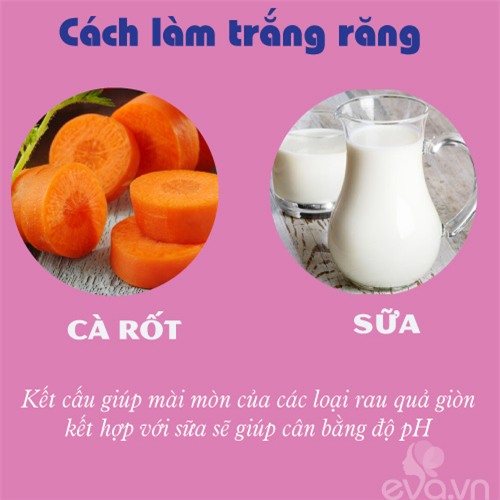 Kết cấu giúp mài mòn của các loại rau quả giòn như cà rốt, táo, ... sẽ chà và từ từ tẩy đi lớp phủ trên răng. Uống kèm theo các sản phẩm từ sữa để cân bằng nồng độ pH trong miệng sẽ giúp hàm răng trắng sáng và chắc khoẻ.